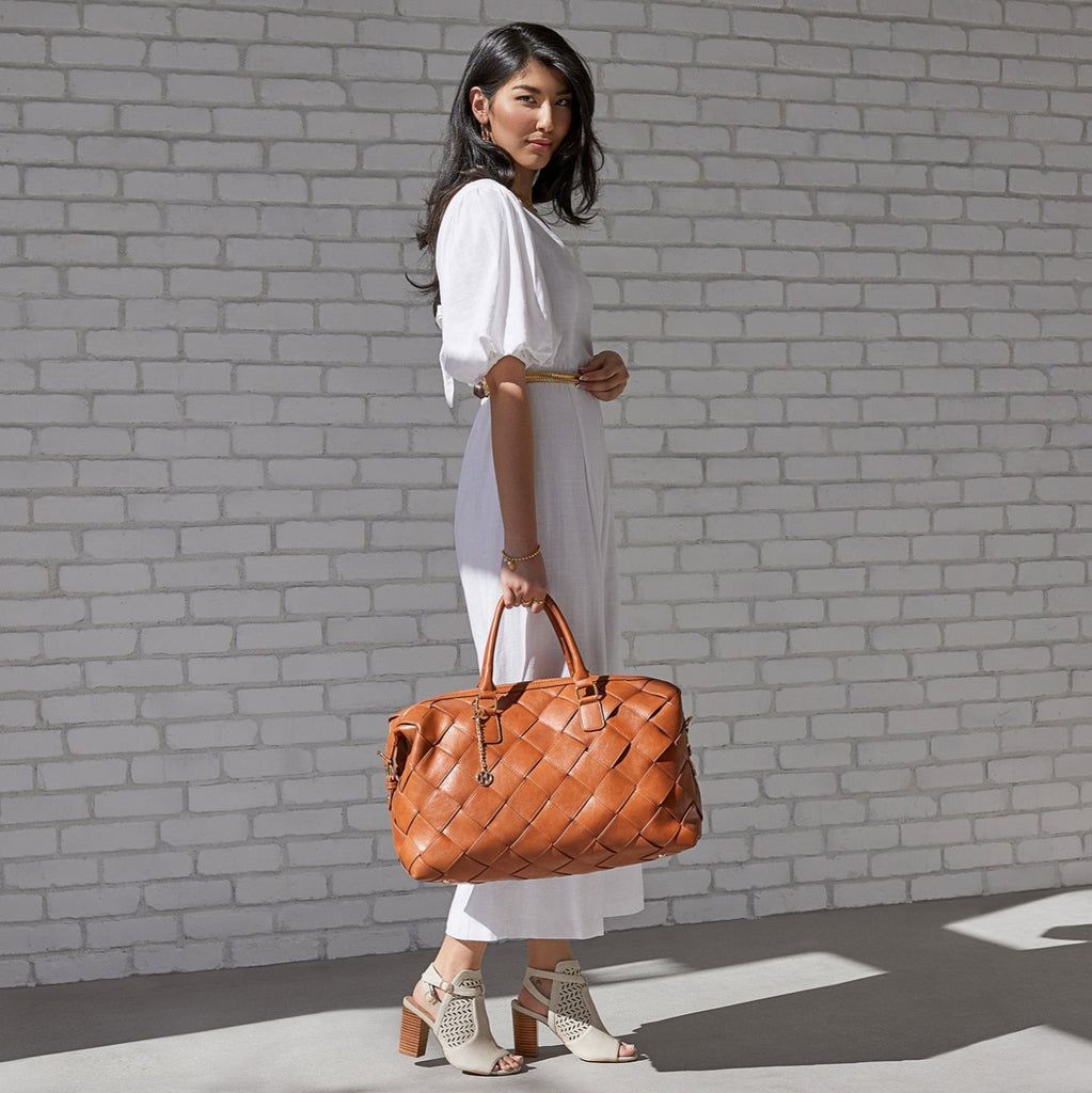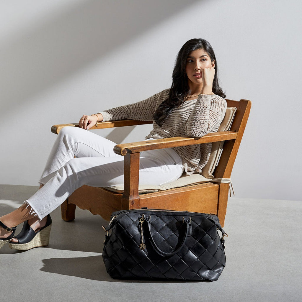 Unwind in style with the BROOKE Woven Weekender in Black. Designed in Montreal, this vegan handbag features an intricate woven pattern made from recycled materials. The spacious interior includes a top zip closure, interior phone pouch, and zip pocket for organized storage. An adjustable crossbody strap ensures comfortable carrying options for any adventure. Perfect for travel or everyday use, this designer bag combines elegance with sustainability.